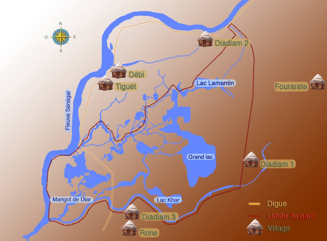 Djoudj National Bird Park is located about sixty kilometers north of Saint-Louis in Senegal.